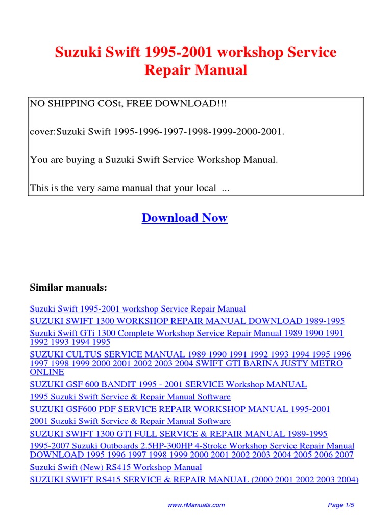 Suzuki Swift SF310 SF413 1900 Repair PDF Service Manual Download Now Suzuki Swift RS415 0410 Workshop Service Repair Manual Download Now SUZUKI SWIFT 1300 GTI FULL SERVICE REPAIR MANUAL Download Now SUZUKI SWIFT FULL SERVICE REPAIR MANUAL Download Now